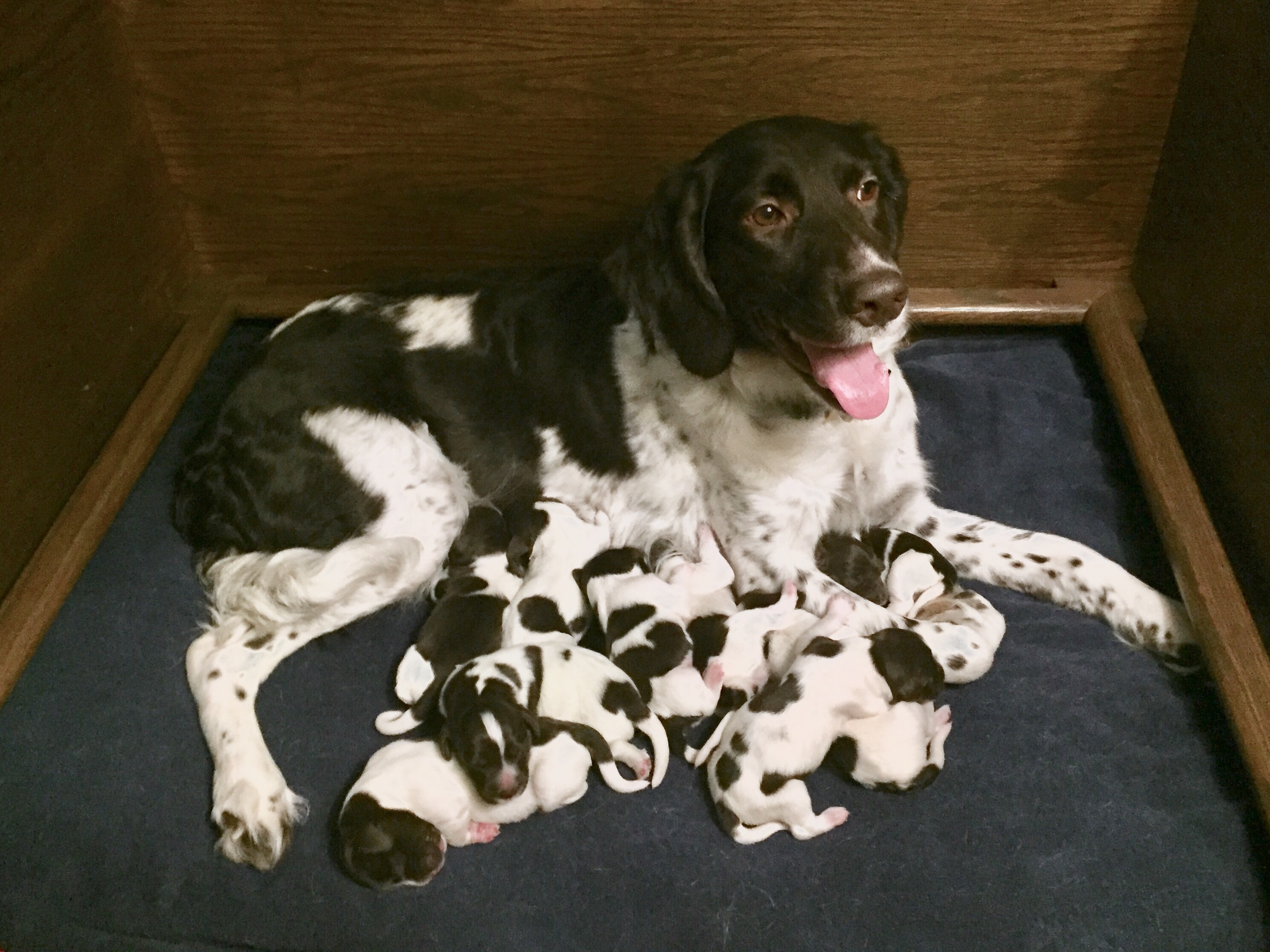 Breck had her puppies yesterday evening. 7 boys and 2 girls. Breck and all 9 pups are healthy and doing great. With 7 males born, it looks like we still have a couple pups available. Please contact us if you’re interested.