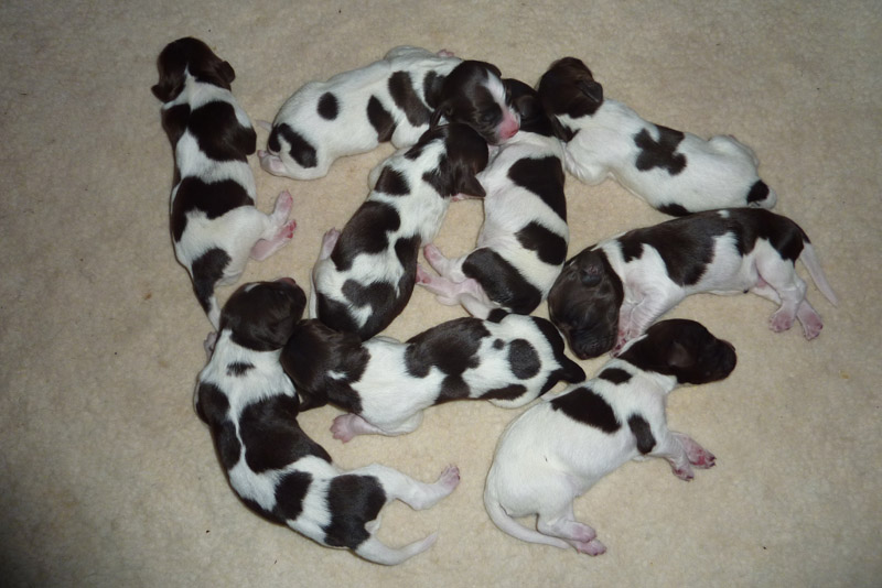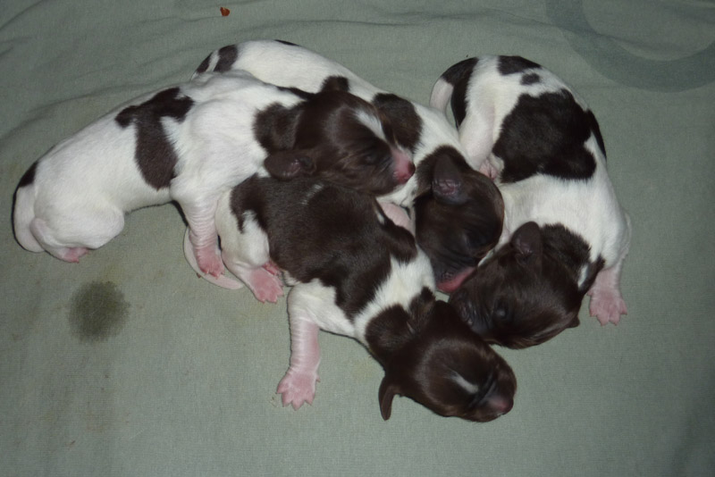 We are excited to announce that puppies were born May 21, 2011. Litha had 9 healthy little puppies, 7 males and 2 females. Looks like there will be 4 roan colored pups and 5 brown and white. The two females were one of each color. See pictures below.