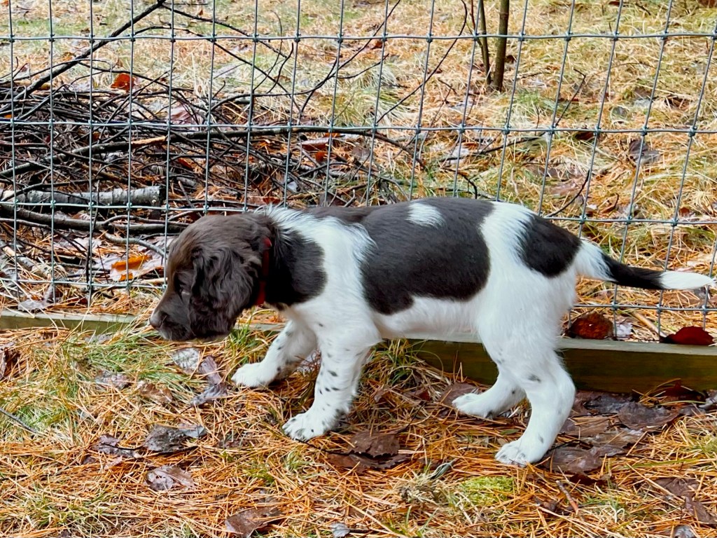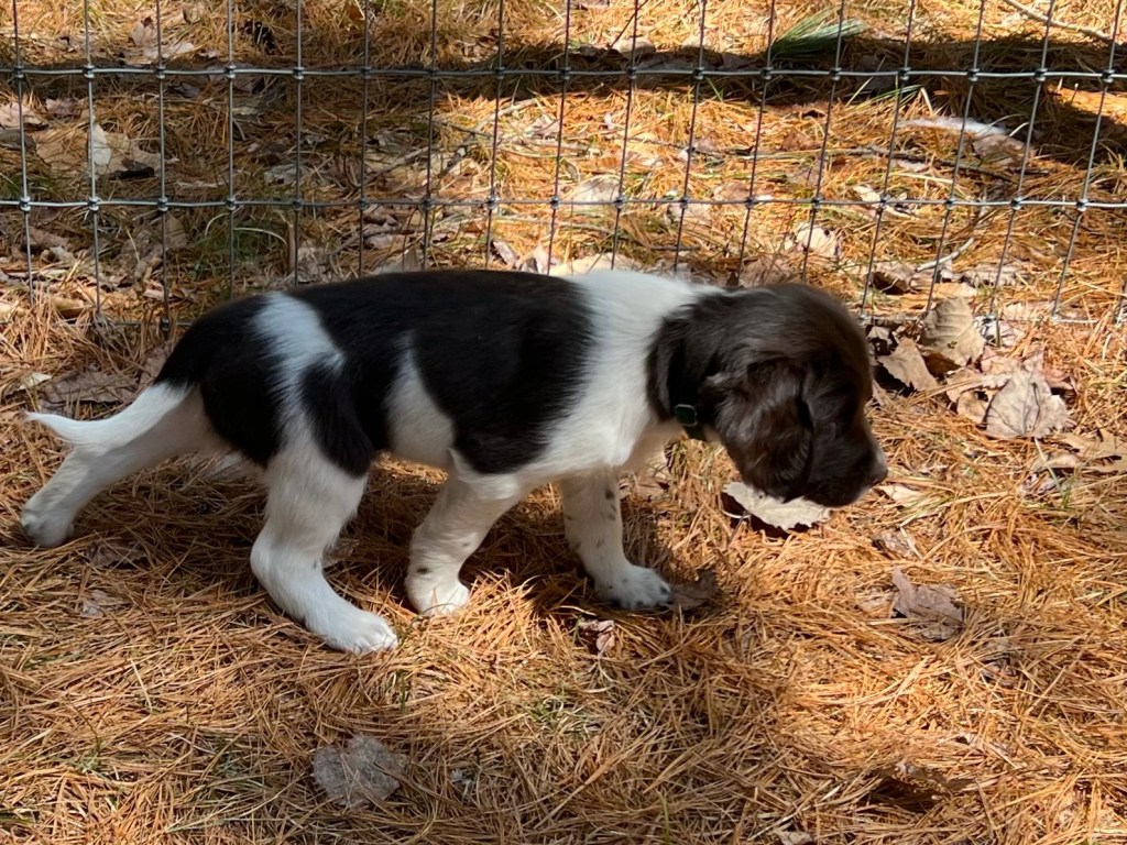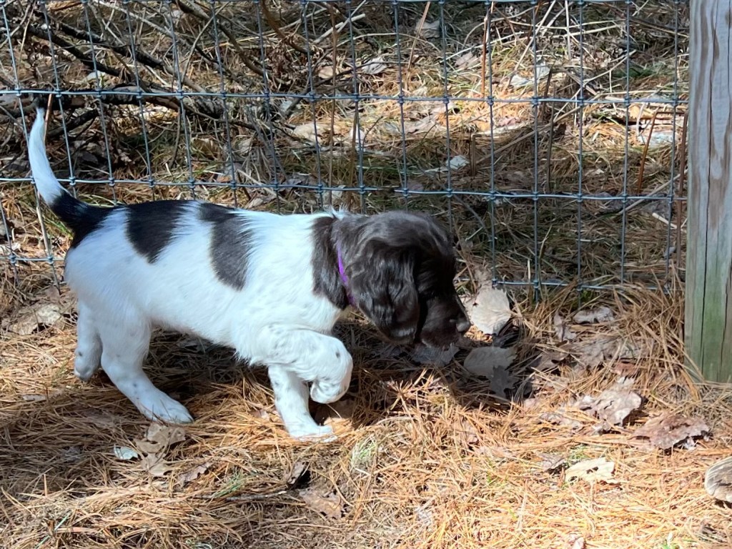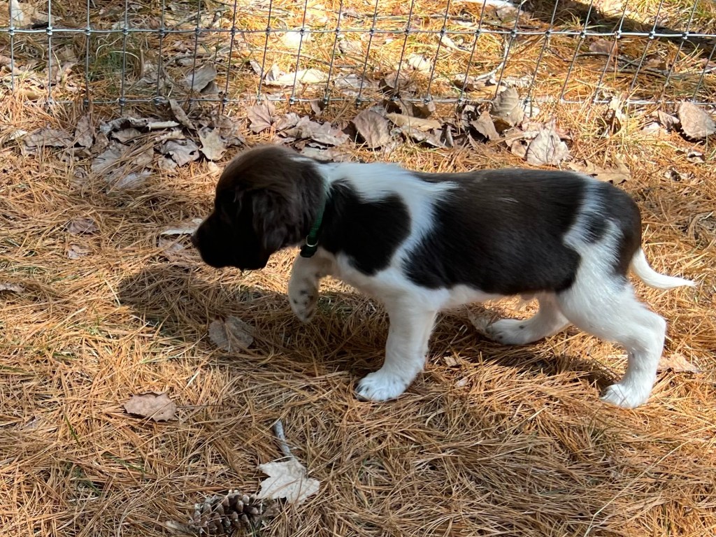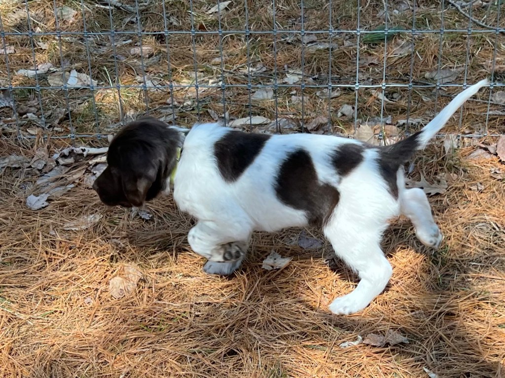 7 week pictures are action shots. With the help of a woodcock wing on a poll, we do our best to get the pups to sight point. If all goes well, there will be sone great pictures.