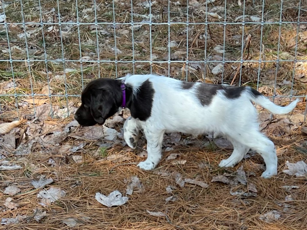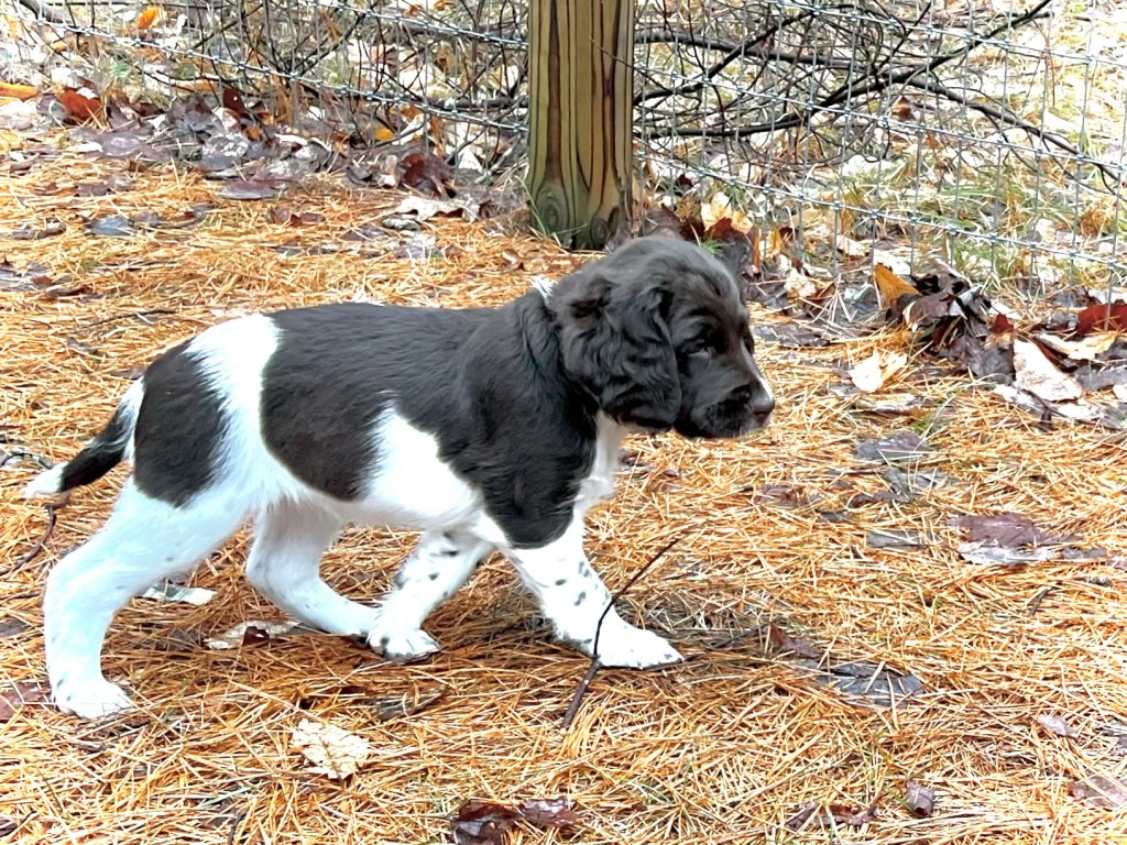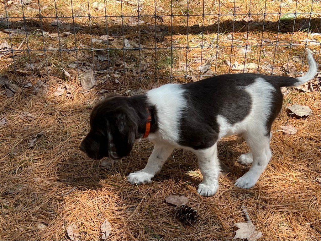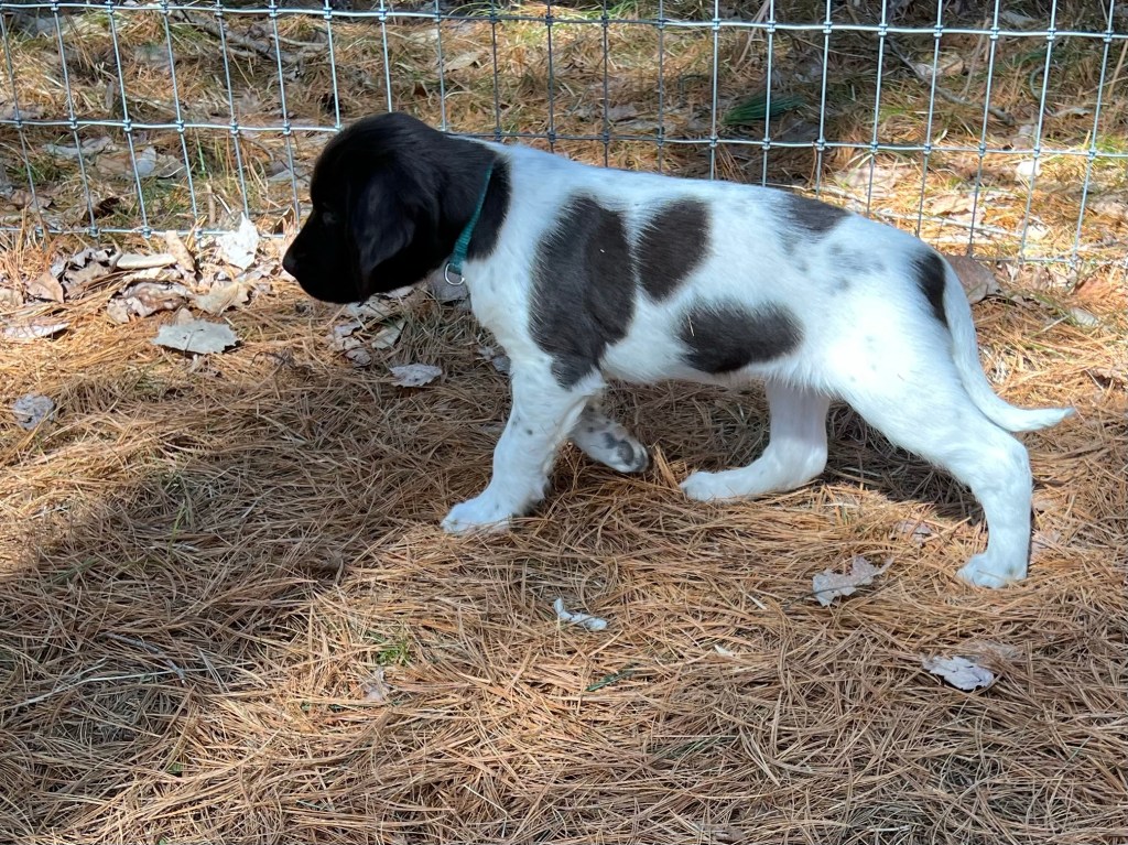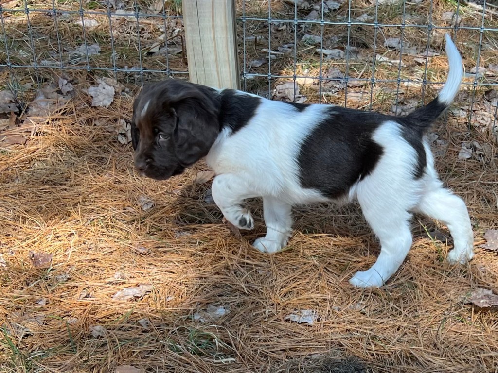 7 week pictures are action shots. With the help of a woodcock wing on a poll, we do our best to get the pups to sight point. If all goes well, there will be sone great pictures.