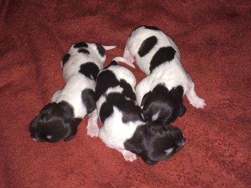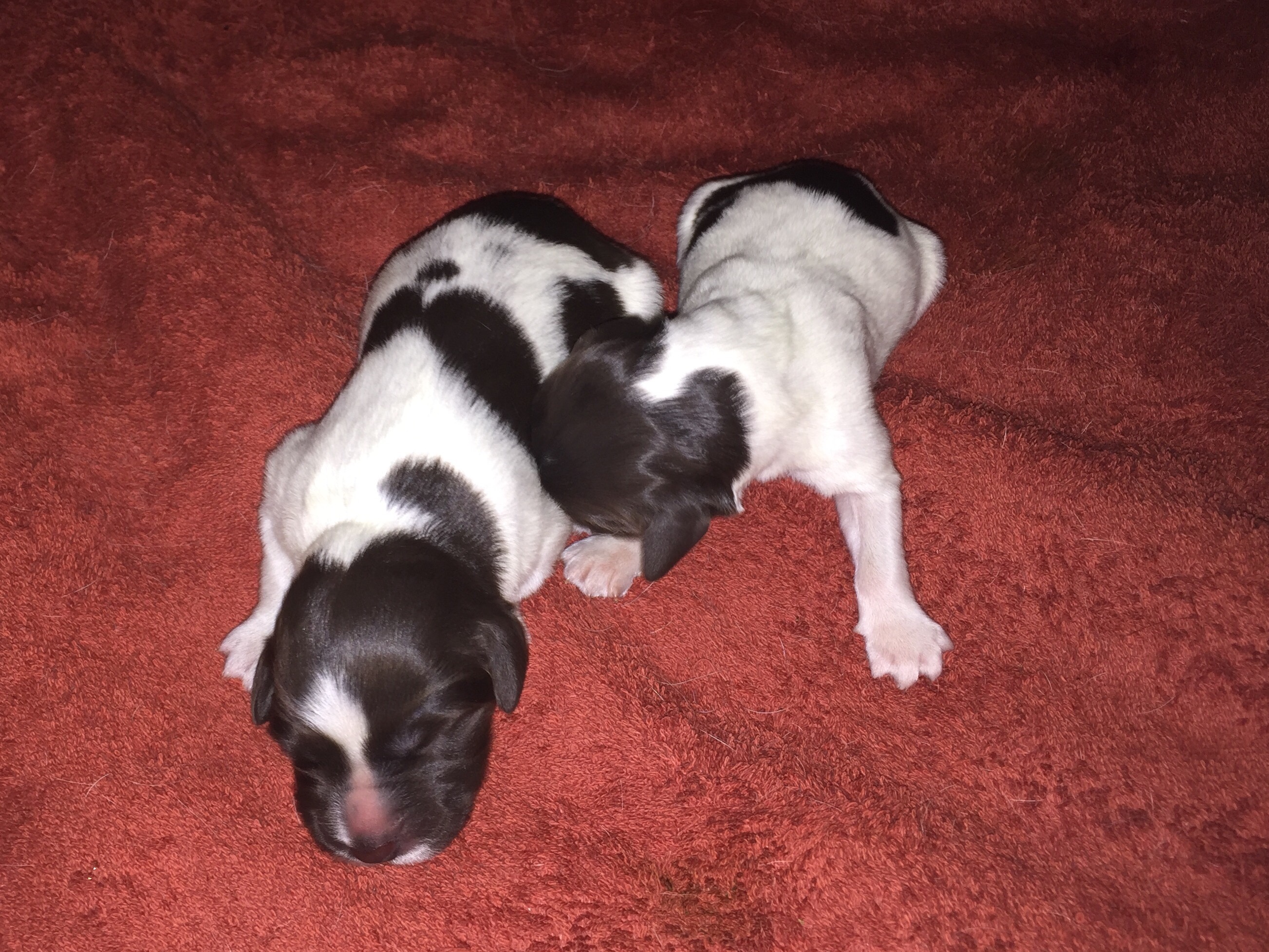 7 males and 2 females. Typically new born pups with pink paw pads will be brown and white, and pups with brown paw pads will roan.